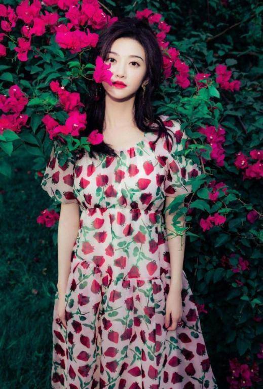 选择印花连衣裙的时候,花色还很关键,像景甜下面这一条连衣裙上面加入红色的花纹,这种亮丽的色彩丰富了整个造型,简直就是名媛啊,而且大面积的花纹铺开,显示出的风格更加贵气。